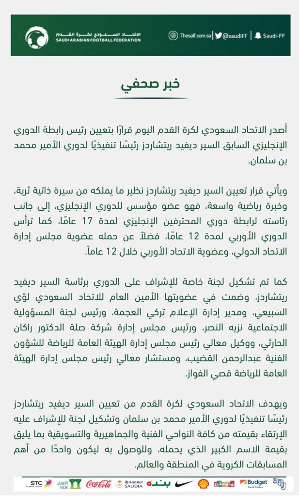 أقوال و معلومات على تويتر عاجل الاتحاد السعودي لكرة القدم يعين السير ديفيد ريتشاردز رئيس ا تنفيذي ا لدوري الأمير محمد بن سلمان ويشكل لجنة خاصة للإشراف عليه Https T Co Q3idvjdab1